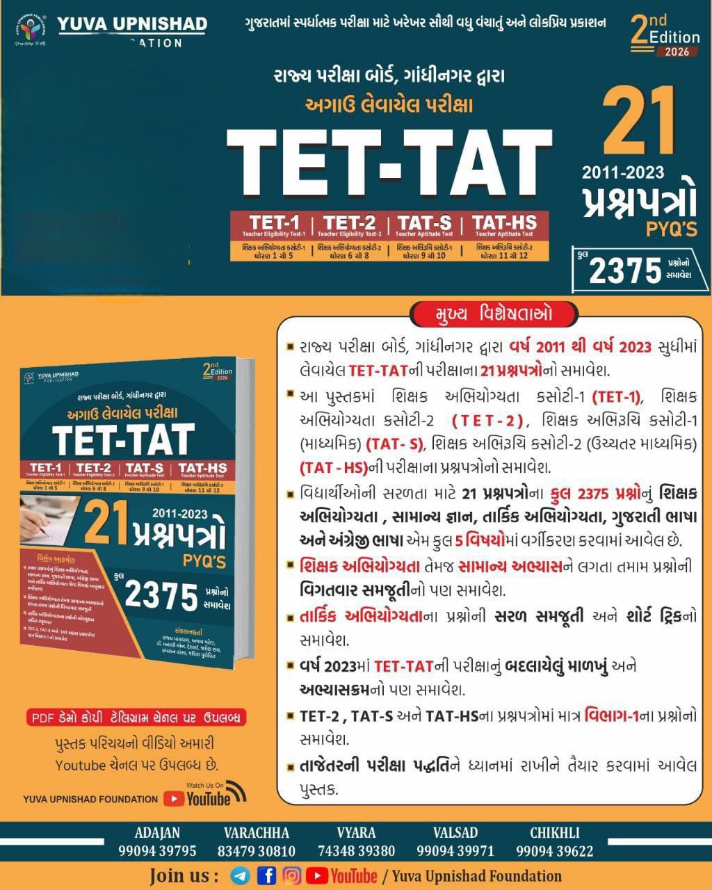 📚 યુવા ઉપનિષદ્ પબ્લિકેશન, સુરત દ્વારા પ્રકાશિત રાજ્ય પરીક્ષા બોર્ડ, ગાંધીનગર દ્વારા વર્ષ 2011 થી 2023 સુધીમાં લેવાયેલા TET-TATની પરીક્ષાના 21 પ્રશ્નપત્રોનો સમાવેશ કરતુ "TET-TAT 21 PAPERSET" પુસ્તક ની દ્વિતિય આવૃત્તિ 2026.