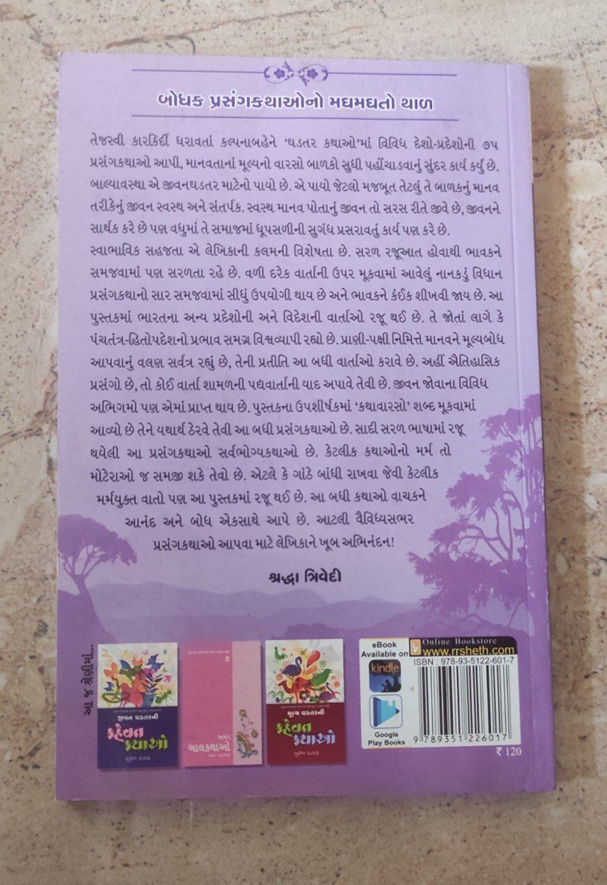 તેજસ્વી કારકિર્દી ધરાવતાં કલ્પનાબહેને ઘડતર કથાઓમાં વિવિધ દેશો-પ્રદેશોની ૭૫ પ્રસંગકથાઓ આપી, માનવતાનાં મૂલ્યનો વારસો બાળકો સુધી પહોંચાડવાનું સુંદર કાર્ય કર્યું છે. બાલ્યાવસ્થા એ જીવનઘડતર માટેનો પાયો છે. એ પાયો જેટલો મજબૂત તેટલું તે બાળકનું માનવ તરીકેનું જીવન સ્વસ્થ અને સંતર્પક સ્વસ્થ માનવ પોતાનું જીવન તો સરસ રીતે જીવે છે, જીવનને સાર્થક કરે છે પણ વધુમાં તે સમાજમાં ધૂપસળીની સુગંધ પ્રસરાવતું કાર્ય પણ કરે છે. સ્વાભાવિક સહજતા એ લેખિકાની કલમની વિશેષતા છે. સરળ રજૂઆત હોવાથી ભાવકને સમજવામાં પણ સરળતા રહે છે. વળી દરેક વાર્તાની ઉપર મૂકવામાં આવેલું નાનકડું વિધાન પ્રસંગકથાનો સાર સમજવામાં સીધું ઉપયોગી થાય છે અને ભાવકને કંઈક શીખવી જાય છે. આ પુસ્તકમાં ભારતના અન્ય પ્રદેશોની અને વિદેશની વાર્તાઓ રજૂ થઈ છે. તે જોતાં લાગે કે પંચતંત્ર-હિતોપદેશનો પ્રભાવ સમગ્ર વિશ્વવ્યાપી રહ્યો છે. પ્રાણી-પક્ષી નિમિત્તે માનવને મૂલ્યબોધ આપવાનું વલણ સર્વત્ર રહ્યું છે, તેની પ્રતીતિ આ બધી વાર્તાઓ કરાવે છે. અહીં ઐતિહાસિક પ્રસંગો છે, તો કોઈ વાર્તા શામળની પદ્યવાર્તાની યાદ અપાવે તેવી છે. જીવન જોવાના વિવિધ અભિગમો પણ એમાં પ્રાપ્ત થાય છે. પુસ્તકના ઉપશીર્ષકમાં 'કથાવારસો' શબ્દ મૂકવામાં આવ્યો છે તેને યથાર્થ ઠેરવે તેવી આ બધી પ્રસંગકથાઓ છે. સાદી સરળ ભાષામાં રજૂ થયેલી આ પ્રસંગકથાઓ સર્વભૌગ્યકથાઓ છે. કેટલીક કથાઓનો મર્મ તો મોટેરાઓ જ સમજી શકે તેવો છે. એટલે કે ગાંઠે બાંધી રાખવા જેવી કેટલીક મર્મયુક્ત વાતો પણ આ પુસ્તકમાં રજૂ થઈ છે. આ બધી કથાઓ વાચકને આનંદ અને બોધ એકસાથે આપે છે. આટલી વૈવિધ્યસભર પ્રસંગકથાઓ આપવા માટે લેખિકાને ખૂબ અભિનંદન! ઈન્ડેક્સ જોવા માટે ટેલીગ્રામ ડાઉનલોડ કરો આપેલ લિંક પર ક્લિક કરો અથવા આપેલ લિંક ને ટેલીગ્રામ માં Copy કરી ક્લિક કરો ખુલી જશે https://t.me/gccbooksstore/7423