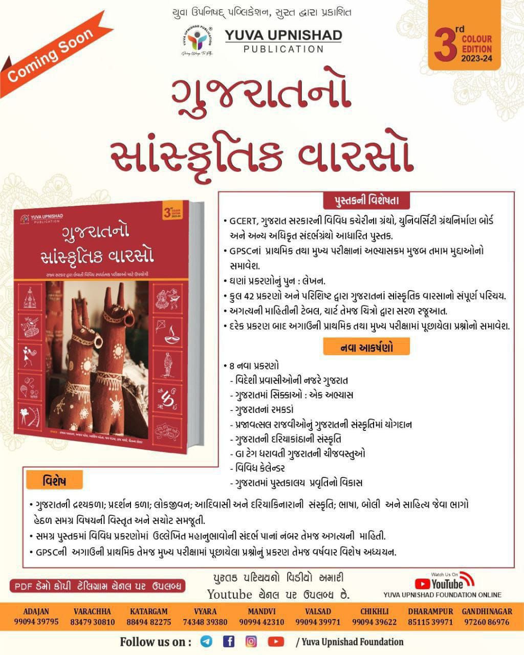 📖 યુવા ઉપનિષદ્ પબ્લિકેશન, સુરત દ્વારા પ્રકાશિત ''ગુજરાતનો સાંસ્કૃતિક વારસો'' વિષયના પુસ્તકની ત્રીજી રંગીન આવૃત્તિ ➡️MRP: ₹540/- ઘરે બેઠા 399 ઈન્ડેક્સ જોવા માટે ટેલીગ્રામ ડાઉનલોડ કરો આપેલ લિંક પર ક્લિક કરો અથવા આપેલ લિંક ને ટેલીગ્રામ માં Copy કરી ક્લિક કરો ખુલી જશે https://t.me/gccbooksstore/8927