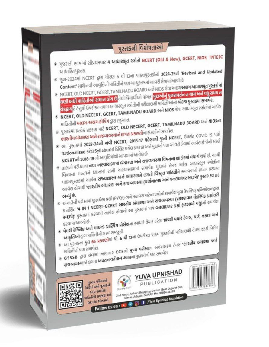 📖 યુવા ઉપનિષદ્ પબ્લિકેશન, સુરત દ્વારા પ્રકાશિત ''4 આધારભૂત સ્ત્રોતો NCERT (OLD & NEW), GCERT, NIOS, TNTESC આધારિત "ભારતીય બંધારણ અને રાજવ્યવસ્થા" (વર્ણનાત્મક અને વનલાઇનર સ્વરૂપે) પ્રથમ આવૃત્તિ -2024