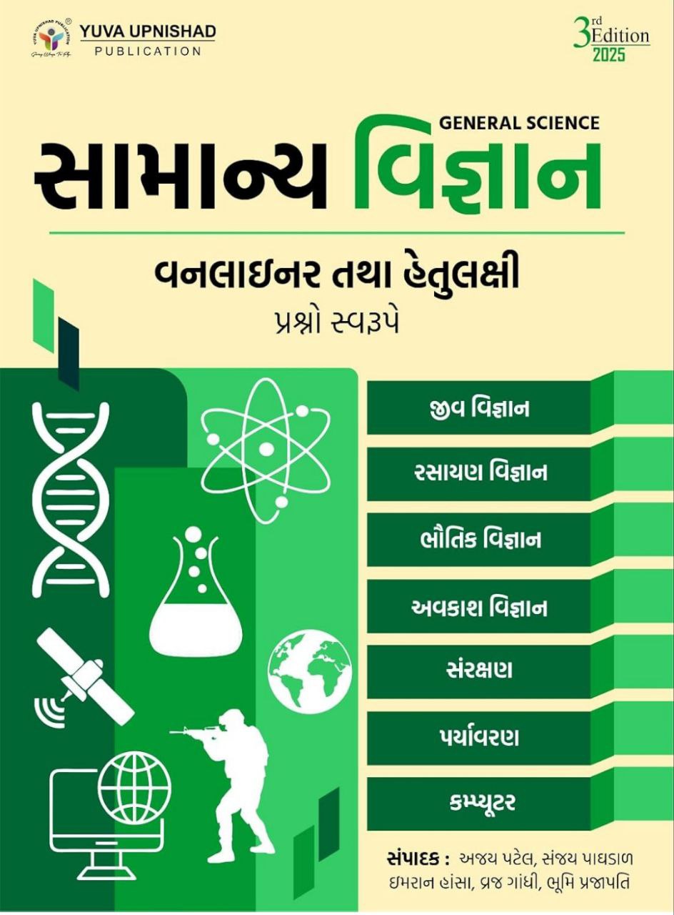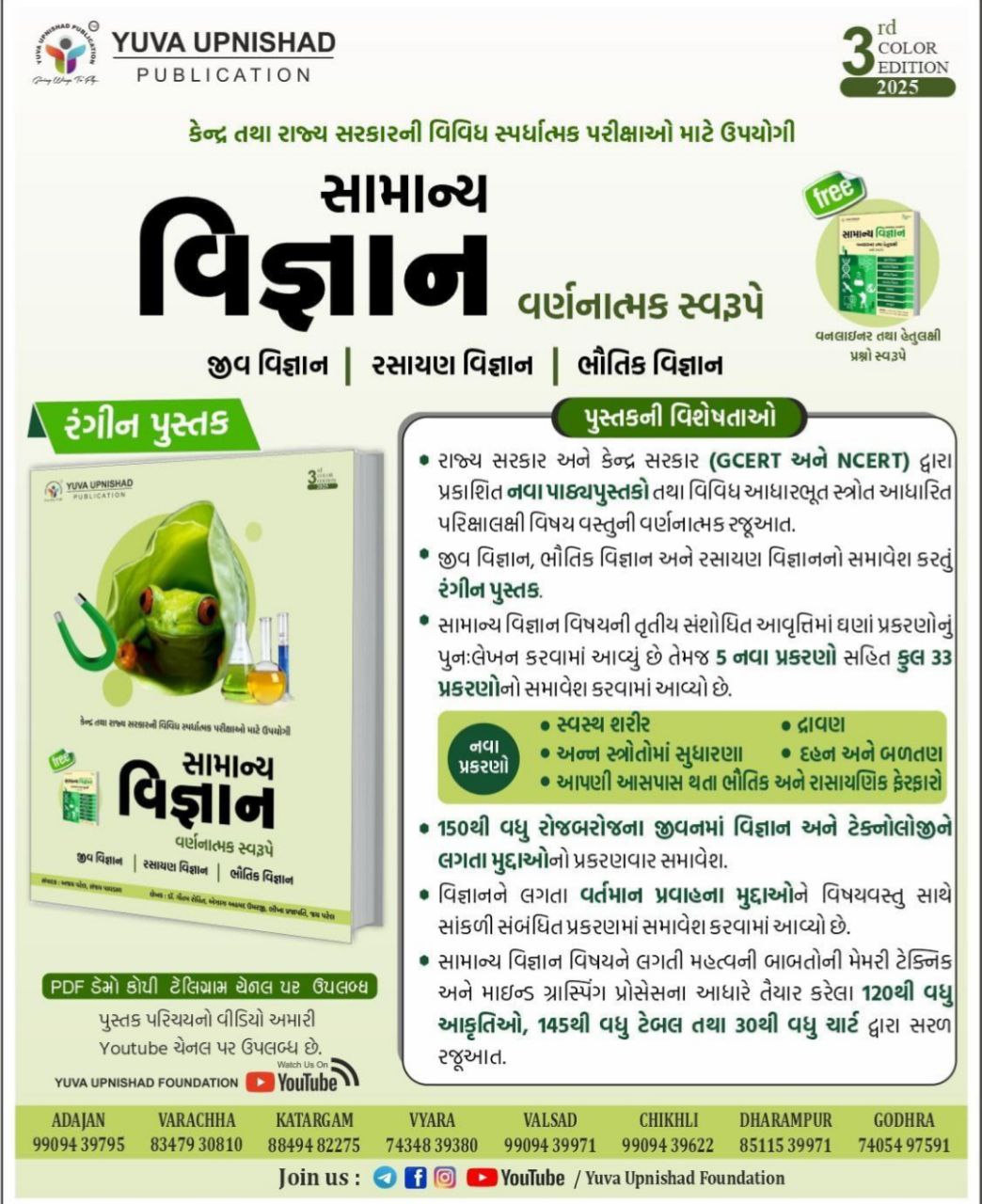યુવા ઉપનિષદ પબ્લિકેશન દ્વારા પ્રકાશિત કેન્દ્ર તથા રાજ્ય સરકારની વિવિધ સ્પર્ધાત્મક પરીક્ષાઓ માટે ઉપયોગી સામાન્ય વિજ્ઞાન (વર્ણનાત્મક સ્વરૂપે) તૃતીય રંગીન આવૃત્તિ - 2025
