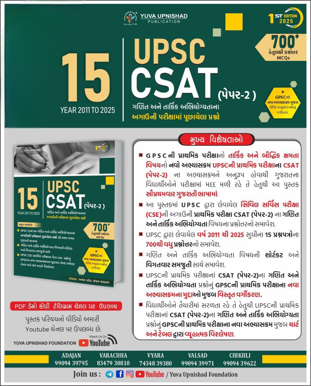 📗 યુવા ઉપનિષદ્ પબ્લિકેશન , સુરત દ્વારા પ્રકાશિત " UPSC CSAT (પેપર-2) (ગુજરાતીમાં)" 2011 થી 2025 સુધીના UPSC CSEમાં પૂછાયેલ પ્રાથમિક પરીક્ષાના (ગણિત અને તાર્કિક અભિયોગ્યતાના) પ્રશ્નોનું GPSC ના નવા અભ્યાસક્રમ મુજબ વિસ્તૃત વર્ગીકરણ આગામી સમયમાં યોજાનાર વિવિધ પરીક્ષા માટે અત્યંત ઉપયોગી પુસ્તકની પ્રથમ આવૃત્તિ- 2025